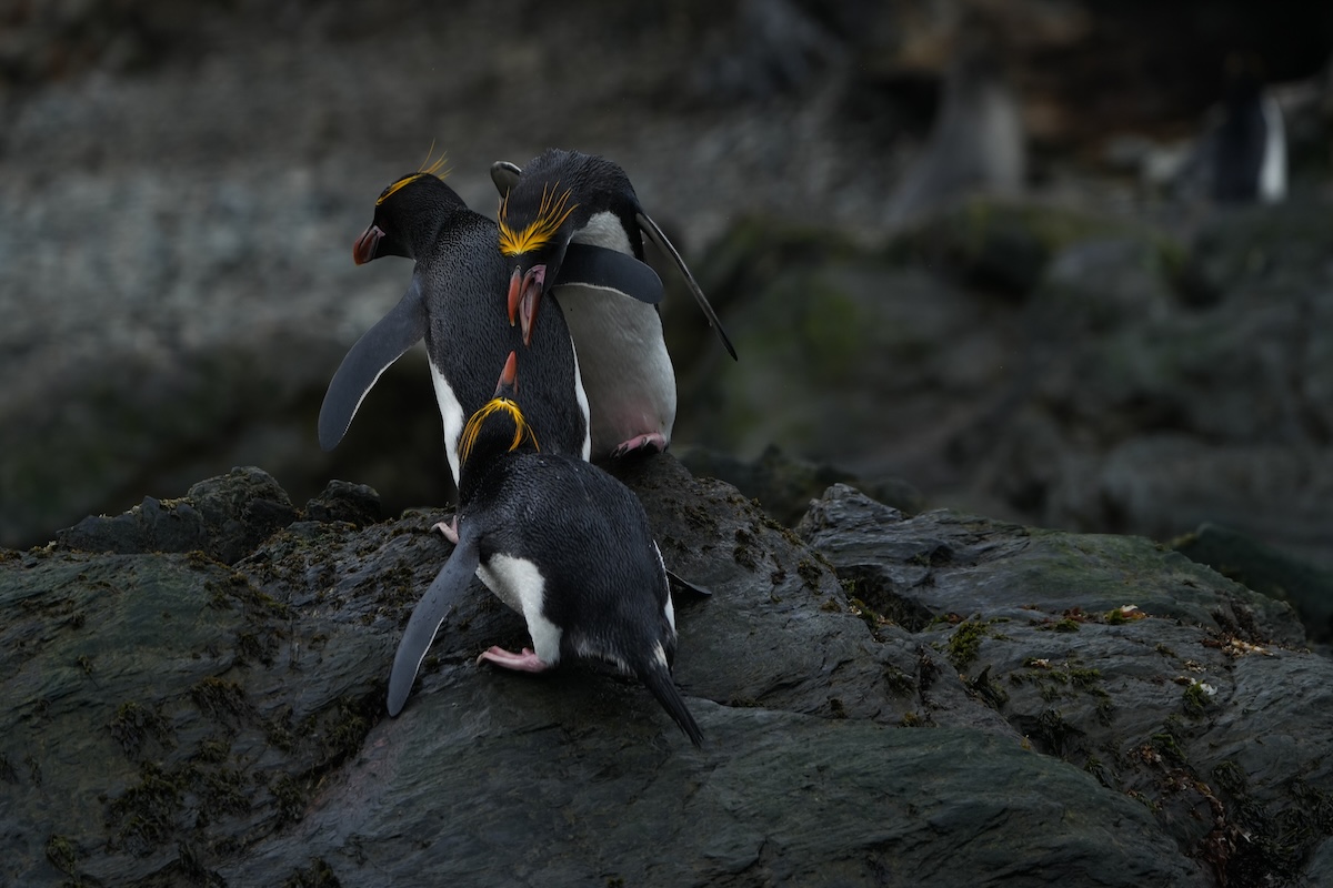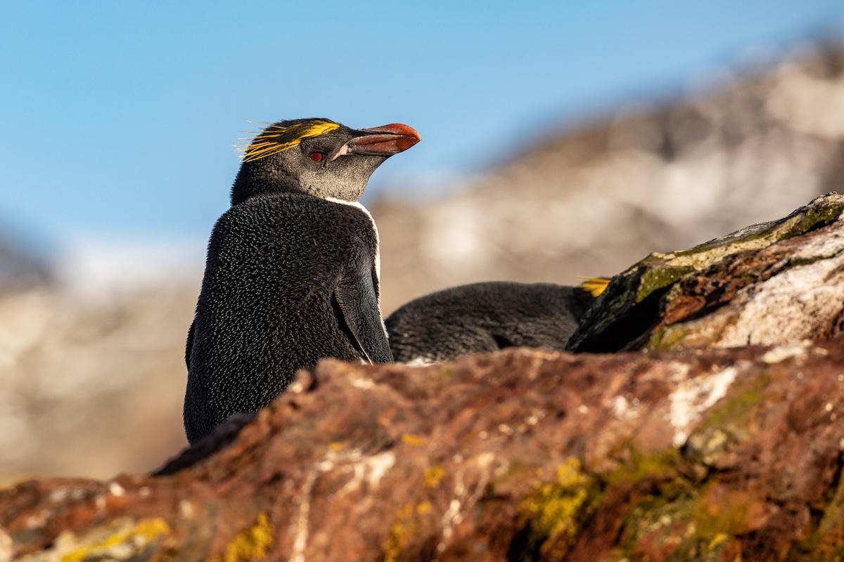 The macaroni penguin’s habitat includes rocky, coastal terrains on Sub-Antarctic islands such as South Georgia and the South Shetland Islands, as well as the Antarctic Peninsula, the Falkland Islands, and parts of southern Chile. Outside the breeding season, they can be found as far north as the coasts of South Africa.