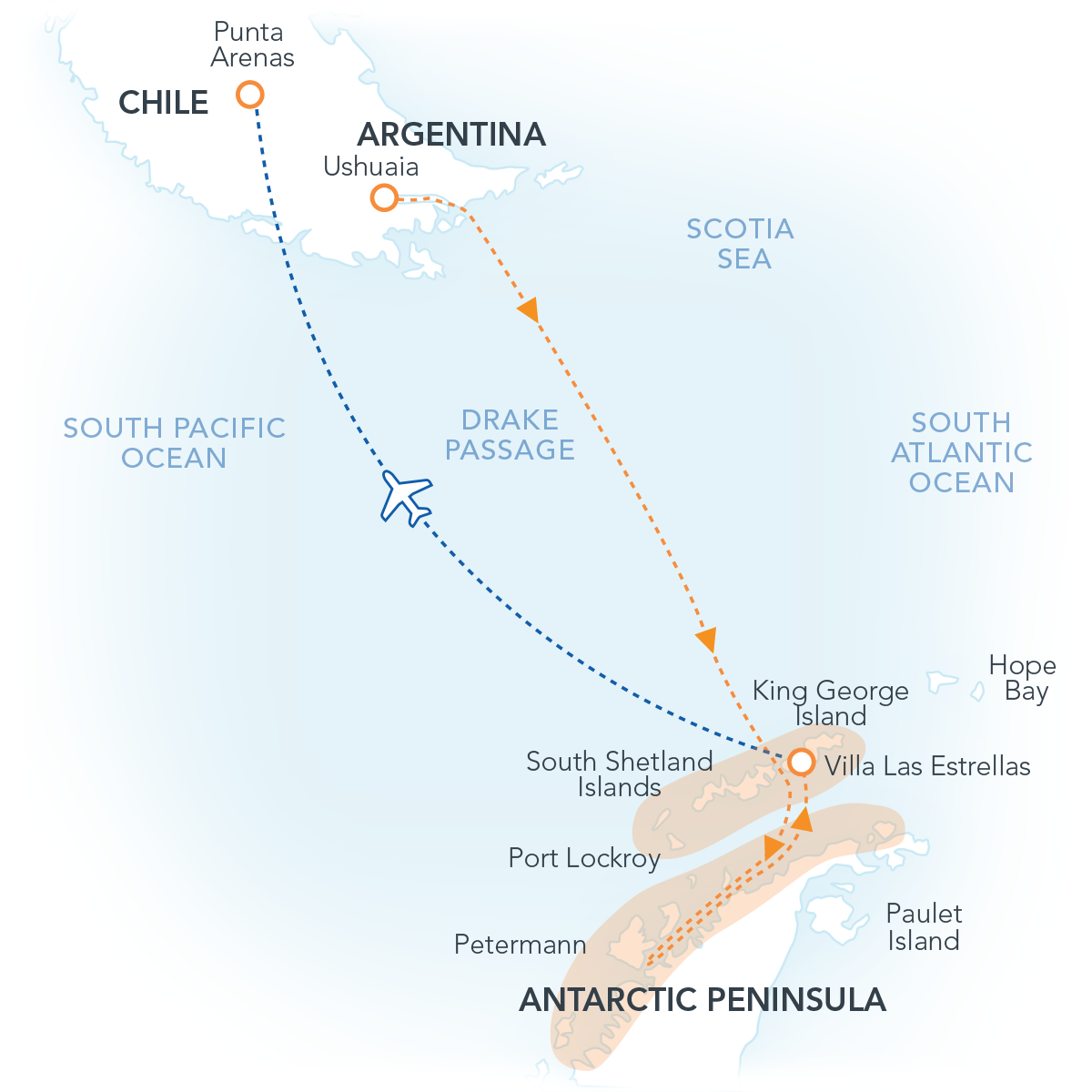 Explore the full range of Antarctic experiences aboard Ocean Nova, one of the most renowned expedition vessels in operation, on this voyage that begins with a crossing of the legendary Drake Passage (by sea) and ends in the comfort of a private flight (by air). Your adventure begins in Ushuaia, our planet’s southernmost city, before embarking on a journey that has set the standard for the term “life-changing.” Join us as we explore the very best of Antarctica, guided safely by your skilled and knowledgeable Expedition Leader and team. Be prepared to marvel at a variety of penguin species, as well as whales, seals, and thousands of seabirds found nowhere else in the world. Experience the jaw-dropping spectacle of Antarctica’s glaciers, icebergs, and mountain vistas. At journey’s end, you’ll take to the Antarctic skies on a private flight bound for the vibrant city of Punta Arenas, where a celebratory dinner awaits.