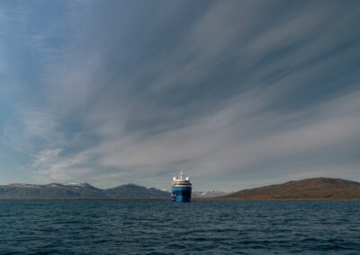 Due to the extreme remoteness and unpredictable Arctic conditions, the itinerary within the park is flexible and dictated by weather, wind, sea, and ice. The Captain and Expedition Leader determine daily plans, which are announced the evening before. Potential highlights include Ella Island’s dramatic 1300-meter cliffs at Bastionen, the historically significant Maria Island — site of a German WWII camp — and Blomsterbugten on Ymer Island, where visitors may enjoy views of the striking Teufelsschloss mountain and its vivid geological layers. Other possible destinations include the calving Waltershausen Glacier, the magnificent Moskusokse Fjord, and the wildlife hotspots of Jameson Land.