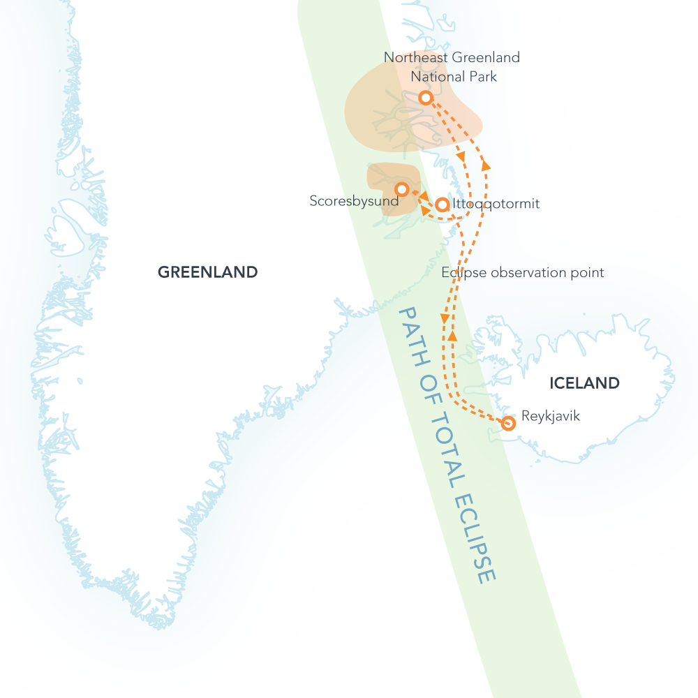 Step aboard Ocean Victory and join a once-in-a-lifetime adventure to view the total solar eclipse in the high Arctic. A dazzling spectacle in one of the world’s most breathtaking destinations. From the vibrant Icelandic capital of Reykjavík, we set sail for adventure-packed days in the Northeast Greenland National Park – Earth’s largest protected wilderness, brimming with wildlife above and below the water. From the National Park, we sail to the storied fjords of Scoresbysund, a maze of fjords and islands in the depths of which we will experience the total solar eclipse. As we depart Scoresbysund we will visit the Inuit village of Ittoqqortoormiit, a remote yet welcoming settlement brimming with Greenlandic culture. Our voyage concludes in Reykjavík, the perfect jumping-off point to explore the Land of Ice and Fire.
